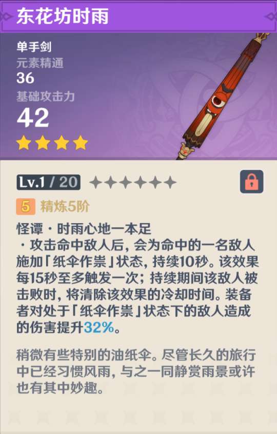 唯二的副属性是防御力的单手剑(另外一把是旅行剑),且还能根据防御力提升E技能的伤害,是为阿贝多量身定做的一把武器,单论E技能后台伤害,这把武器就是超越五星单手剑的存在。可惜活动武器目前没有复刻的先例,今后也很难说,希望有机会吧。