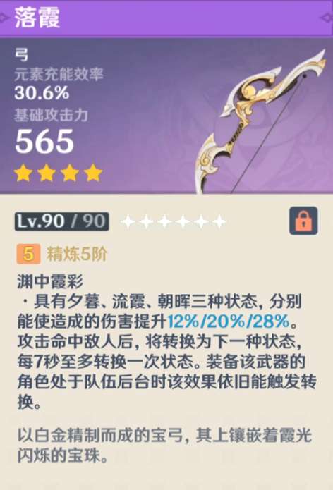 落霞这把武器相信大家都很熟悉了,是2.7版本「危途疑踪」的活动武器,不少玩家都已经拿到手了。这把武器在四星武器中拥有比较高的白值,以及元素充能效率的副属性,被动是增伤效果,但是需要一定的启动时间。