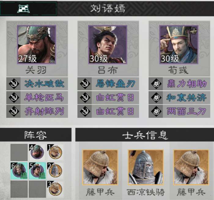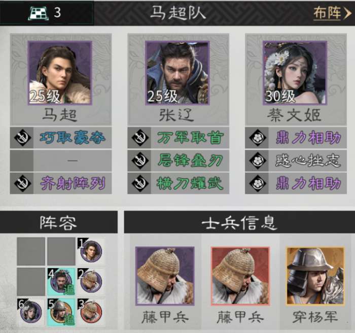 该阵容输出相对暴力,需要在兵种选择上提高坦度,推荐选择陷阵营、西凉铁骑、藤甲兵这类防御型兵种,放在队伍前排抗伤。