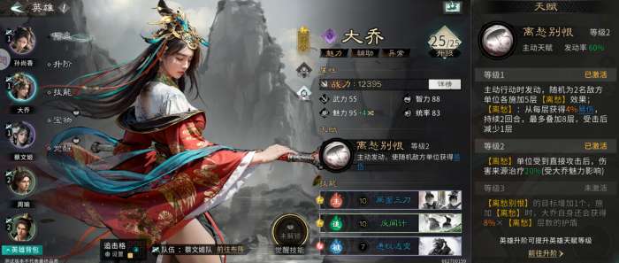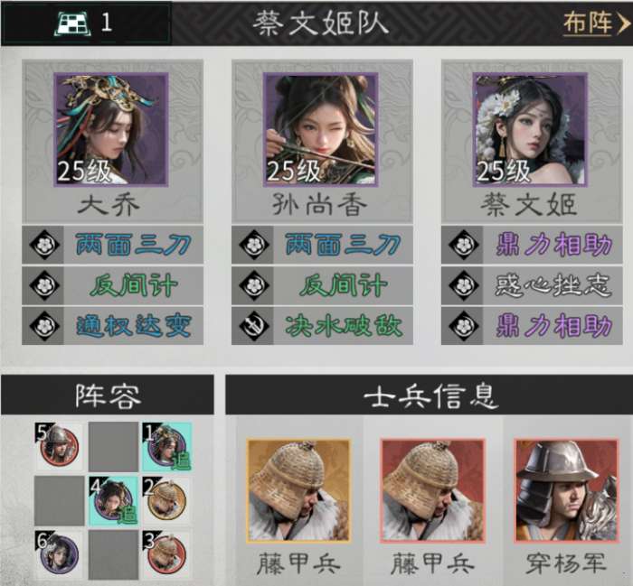 因为大乔自身带有一定坦度,且需要与孙尚香互踩追击格,兵种选择上,推荐藤甲兵或陷阵营在前排抗伤,后排补充一个穿杨军或连弩军补伤害。
