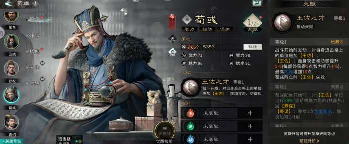 天赋技能【王佐之才】:对自身追击格上的单位施加【王佐】(攻击和防御提升5%,最高四维增加10点),荀彧阵亡时【王佐】失效。