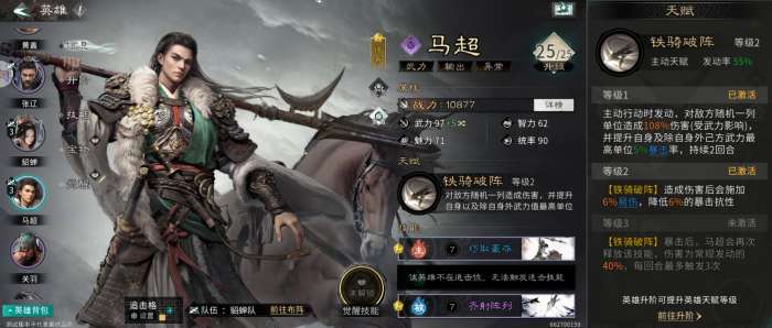 天赋技能【铁骑破阵】:对敌方随机一列单位造成伤害,并提升自身及除自身外己方武力最高单位5%暴击率,持续2回合。