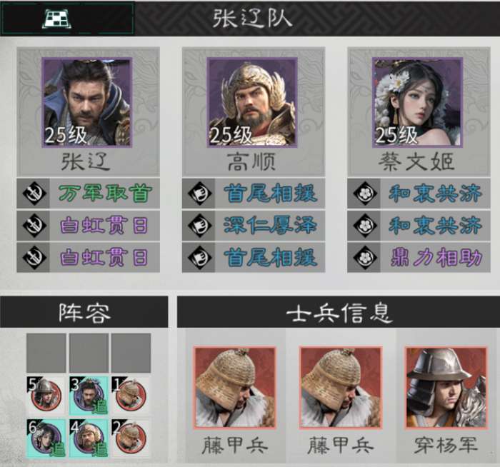 张辽的天赋技能就是在追击时发动,搭配蔡文姬双重发动可以对敌方后面造成致命打击。高顺可以在前排召唤陷阵勇士,并且提升我军全体格挡率,可以很好地保护全队。