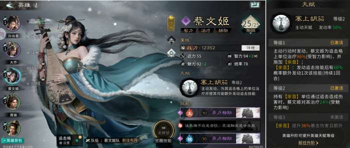 天赋技能【塞上胡笳】:治疗追击格上单位,并提供余音效果(发动追击技能后有60%概率额外发动1次该技能)。