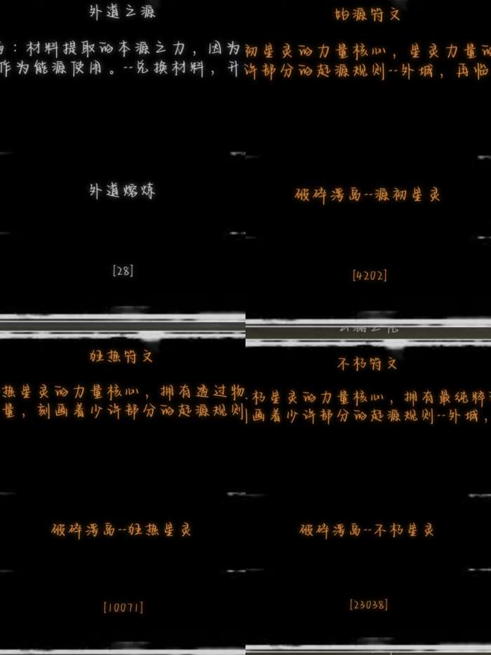 笫四张图为图4的材料掉落,分别对应三大星灵,其中外道之源和魔气碎片一样,属于哪都能用得到的资源,三种符文主要用于研究院的符文铭刻,御城狩猎小队的增益,以及无尽之海的玄海之印开级。