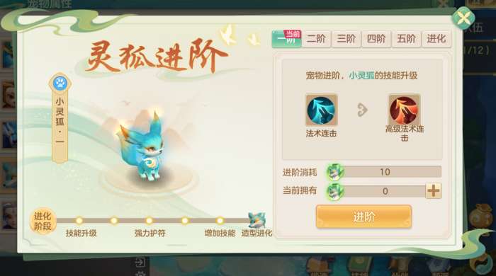 使用进阶石可对小灵狐进行六次进阶,最终进化为造型强化的幻灵狐。