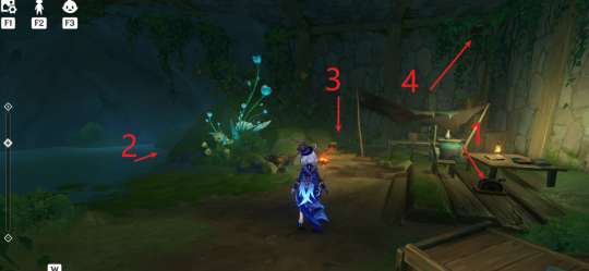 四个机关,顺序为椅子旁 --> 水边 --> 火堆旁 --> 墙上,如下图,完成后,桌子背后的墙面右侧出现入口,获得珍贵的宝箱。