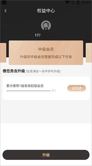 3、点击去完成,软件即可把你带到具体任务界面,在完成任务后再次来到这个界面就可以点击下方的“升级”按键了。