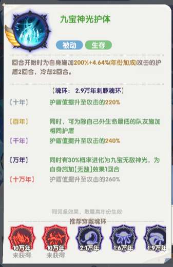 每回合结束时,为1名生命最低的队友恢复宁荣荣生命上限10%+(年份加成)的生命