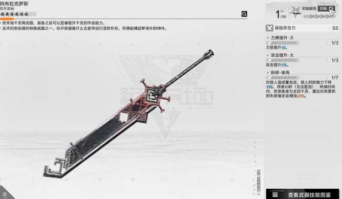 那么接下来为大家推荐的这个武器叫做阿布拉克萨斯,在当前的初始属性上面可以带来的力量提升、攻击提升数值都不高,但是他的技能确实是非常好用,潜在力量属性上面它虽然只能提升15%,攻击提升8%,但是根据他的粉碎破壳这个技能可以给敌人带来的重击效果是非常强势的,而且在敌人在防御下降了之后,可以达到的一个数值是13%的破防效果,后期虽然没有办法进行叠加但是在十秒的时间之内,这个装备者作为控制类型的武器,可以带来的重击会对敌人累计造成足够的失衡值,这里达到的值也有20%的数值了,所以相对大家想要针对敌人的失衡值来进行打击的话,阿布拉克萨斯当前的能力是非常强的。