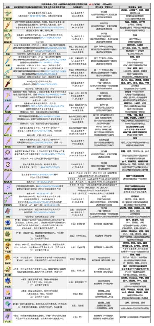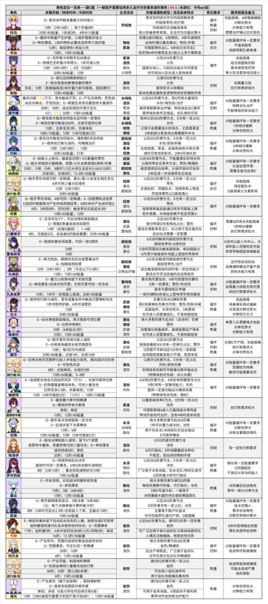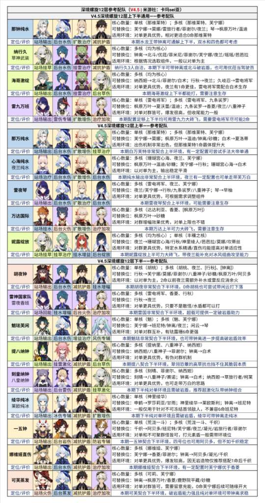 本篇为V4.5的版本配队附录,提供当前版本深境螺旋12层的参考配队及其分析依据,并以一览表的形式收录当前版本的全角色主流定位。