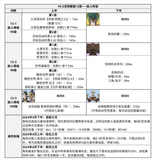 本期深境螺旋12层敌人(与元素地脉debuff)分布以及渊月祝福描述如下: