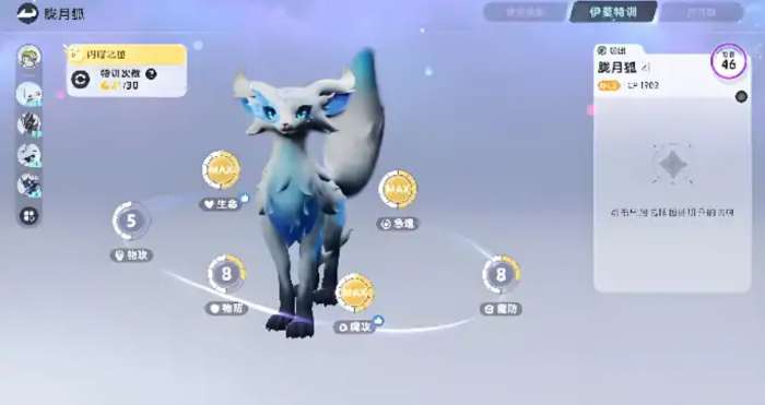 在这个阵容搭配之后,就非常适合前期大家进行开荒的战斗了,那么这个战斗其实后期属性面板大家也可以关注一下,因为这里的月光狐,其实在属性面板上也是属于平民阶段比较顶尖的一个水准,前期如果大家想拥有性价比比较高的神宠,它绝对是其中的一个,而且相对于其他的宠物来说,它的进化速度会更快一些,只要将它培养到18级,再完成朝村花的相关任务,这个宠物就可以开始进行进化了,所以相对于其他角色22级可以进化的阶段来说,它进入进化阶段会更快一些,进化之后,它在外观上面也会有一定的变化,而且还可以做一些特殊的强化技能,在实战能力上面它绝对是非常强的,后期如果大家想要用到他的光系角色克制优势,比如遇到了一些暗系boss的话,基本都可以用它来上场。