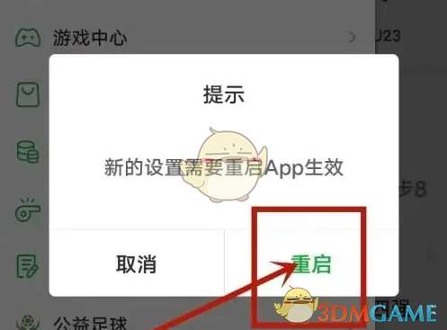 3、点击“重启”选项,重启APP后即可开启深色模式。