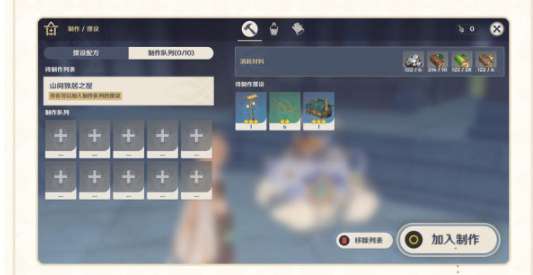 缺少的可制作摆设可以加入阿圆-制作摆设界面的待制作列表,待制作列表中的摆设可以一键快捷加入到制作队列中进行制作,旅行者点击制作队列全部获取时,若队列中的摆设没有完全制作完成,可以使用仙速瓶一键收取队列中的所有摆设。
