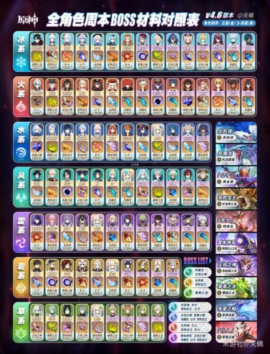 图表右侧是全周本名单、方位、各元素玉石掉落对应的BOSS参照表