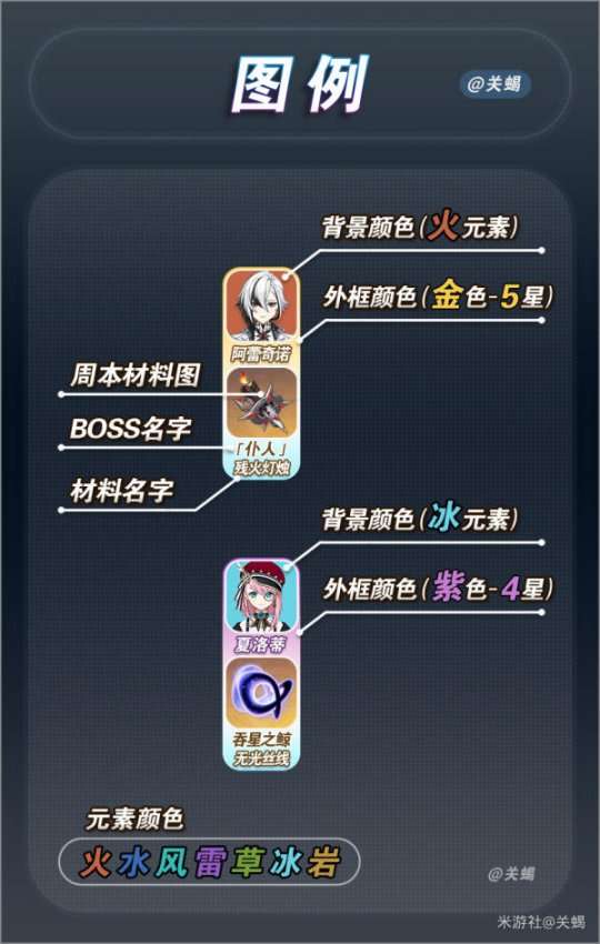 与(表一)同理,角色头像背景的颜色代表对应的元素颜色,头像外框的颜色代表星级,即金色框(5星角色)和紫色框(4星角色)。