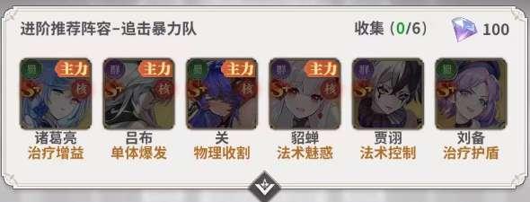 该阵容采用“4+2”配置结构:四名主力承担核心输出与追击循环,两名辅助提供生存保障与控制补充。其中,诸葛亮、吕布、关羽、貂蝉为第一梯队,负责技能衔接、怒气管理与追击触发;贾诩与刘备作为第二梯队,分别强化群体压制与持续续航能力。