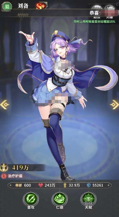 刘备提供双重生存保障:其治疗技能可恢复全体友军相当于刘备自身攻击力40%的生命值,并生成等同于其攻击力100%的护盾。此外,该护盾还附带10%免伤效果,显著延长前排承伤时间,确保追击链在持久战中不因减员而中断。