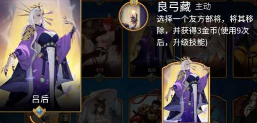吕后就是一个金币制造机,移除友方部将之后就能赚到三金币。在升级之后卖掉高星卡,收益还可以直接翻倍。前期优先拿上阵招募效果的武将,触发效果之后就需要立刻卖掉。理财的同时还可以保证战斗力。