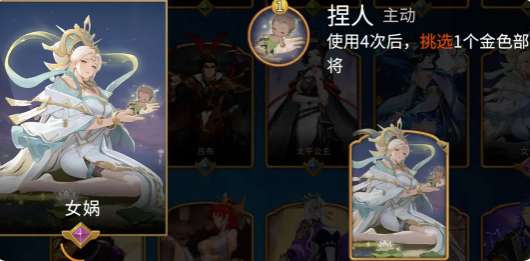 女娲的捏人技能也被称之为理财神器。使用4次就会送金色的部将,星级还会伴随着商店等级去浮动。4个回合,8个回合,12个回合触发,性价比还是比较高的。开局空城,不要盲目去拿卡,如果遇到李秀宁或者是李元芳,那么拿卡才比较合适。就算没有开到高费卡,也可以靠优质卡碰六稳阵,技能可以重复的使用。成型的速度就会超过其他的统帅。