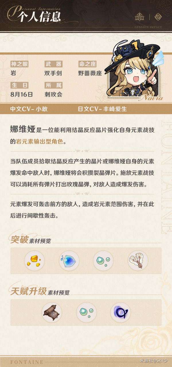 4. 元素爆发:娜维娅的爆发技能是大幅度提升自己的攻击力和攻击速度,同时还可以对敌人造成大量的伤害。这个技能可以让娜维娅在短时间内输出更多的伤害,是她在战斗中的重要技能之一。