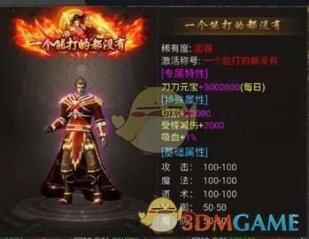 2、王者赞助专享,购买需300000灵符,可获得角色时装:暗黑天魔。专属特性:刀刀元宝+10000000(每日),切割+40000,受怪减伤+4000,吸血+1%