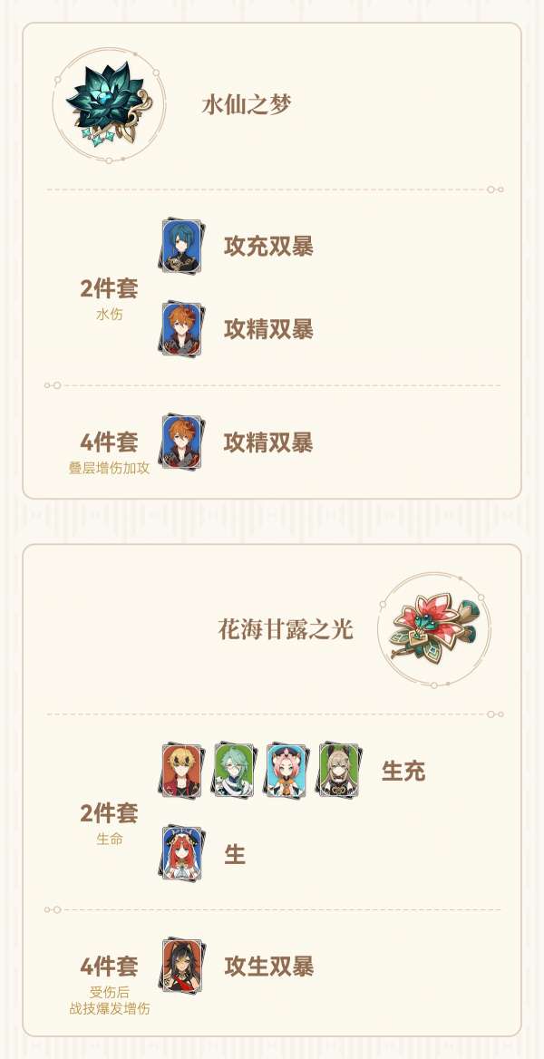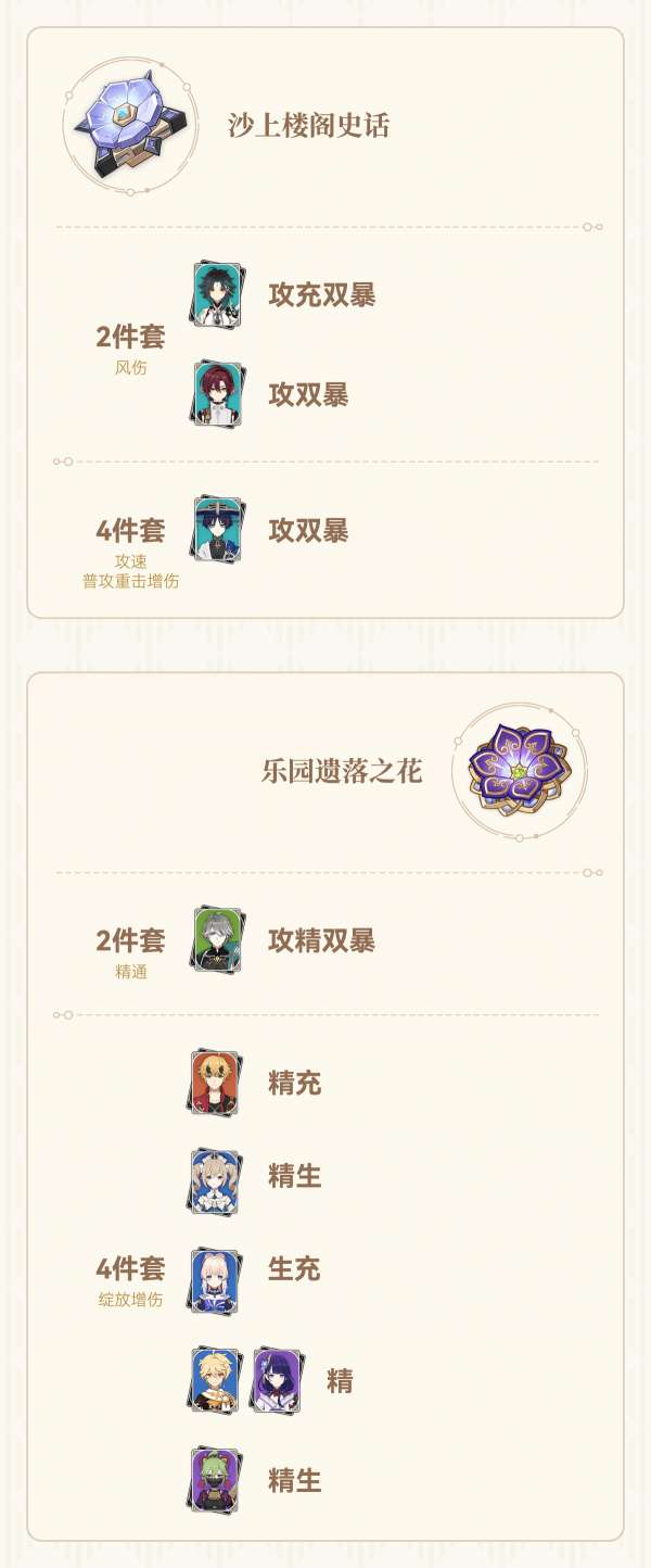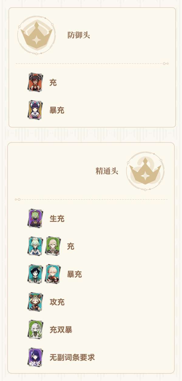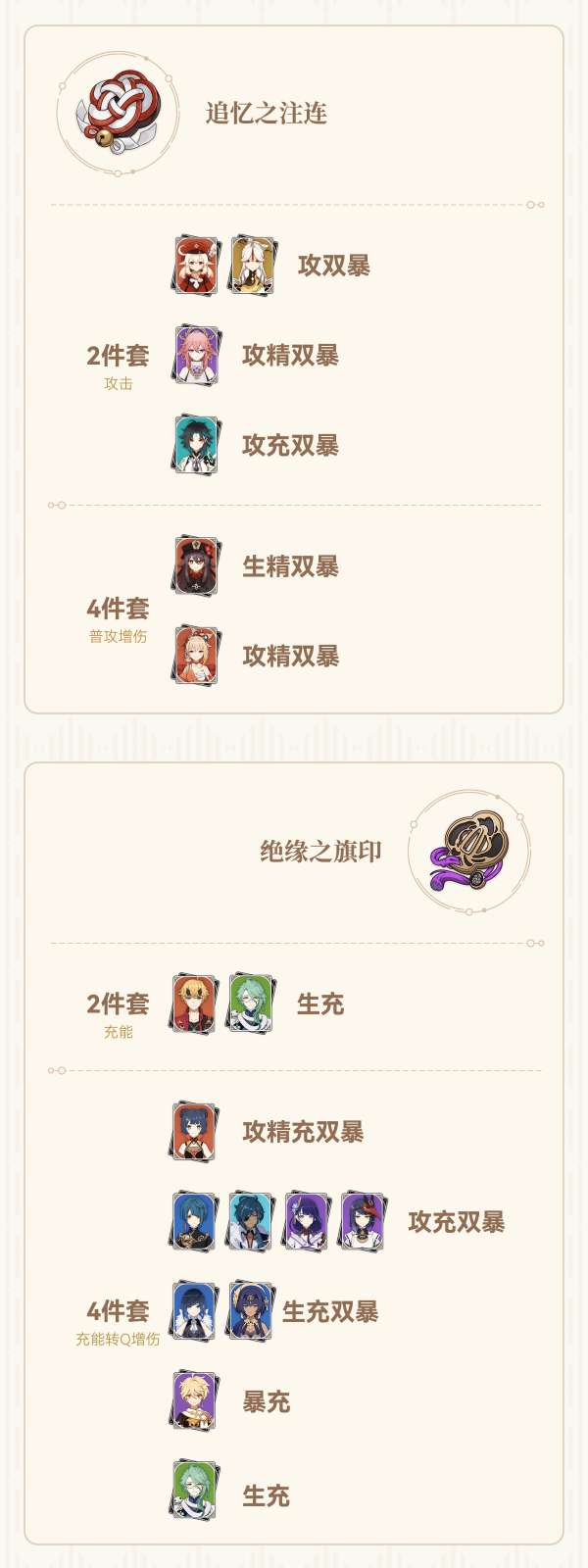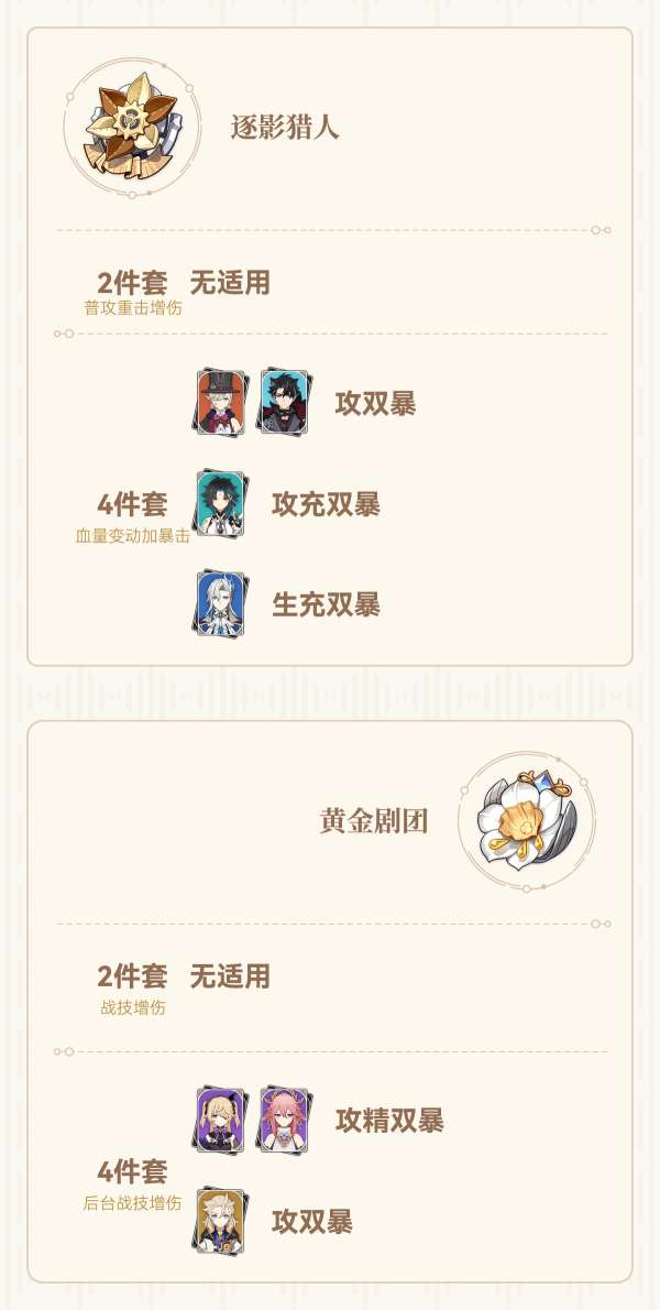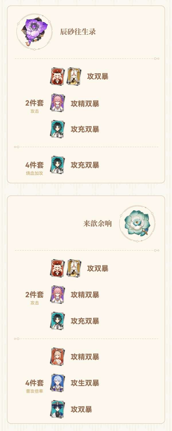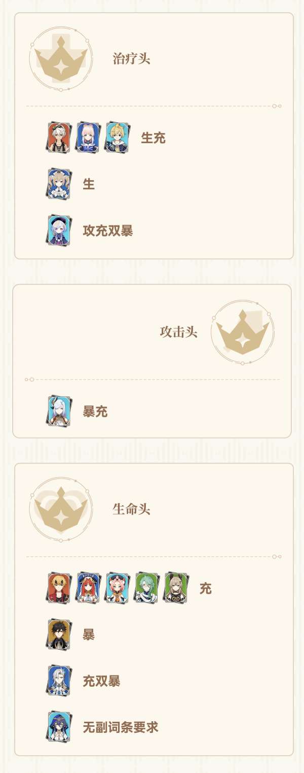 (双暴头,属性伤害杯,攻击沙是一个输出角色的通用配装,不再详细列出适用角色。特别注意暴击头还可能给辅助角色用来触发西风武器)