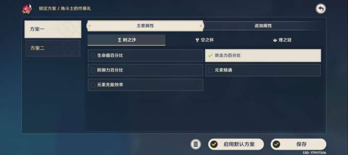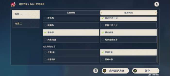 (3)此时可以使用《圣遗物留弃指南》本攻略,查找该套装适用的角色,确定待养成的角色。选择主属性(主词条),选择追加属性(副词条),并且选择副词条数量,可以一般留2条。