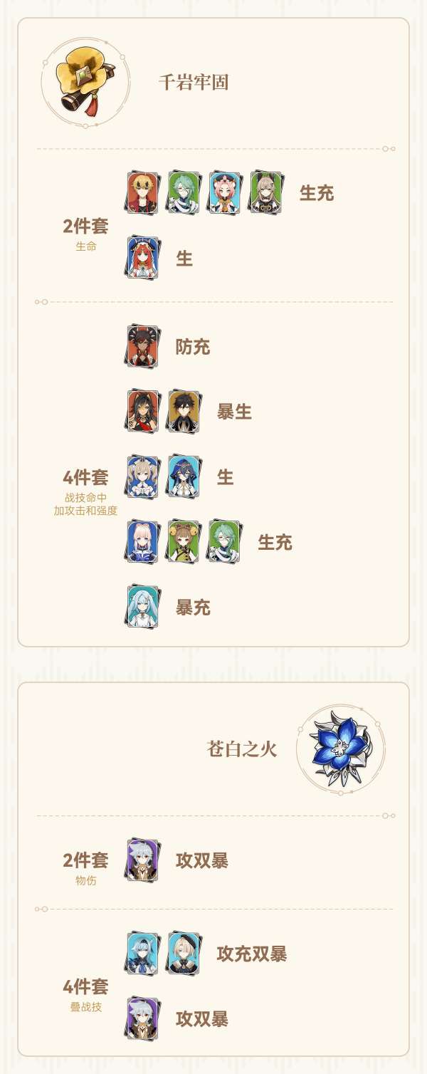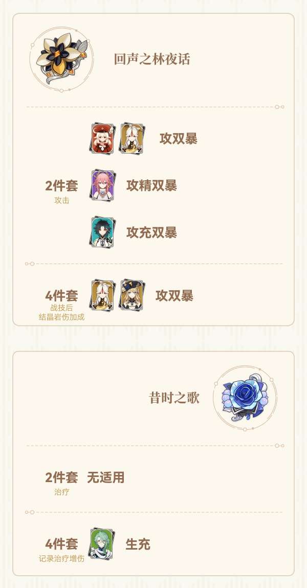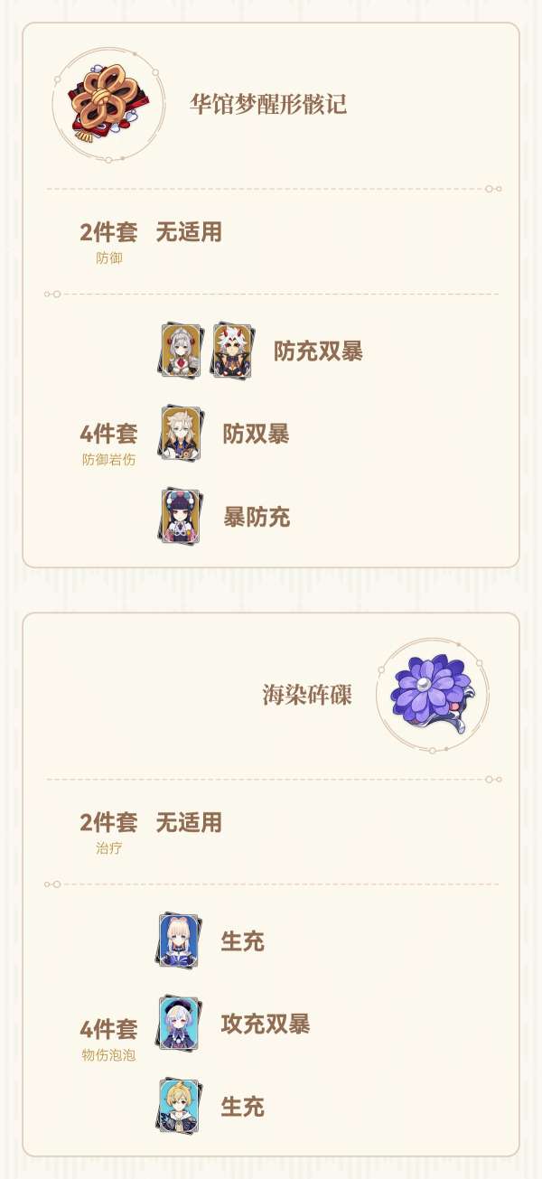 本次更新将枫丹所有新角色的配装与词条需求都写进了本版《圣遗物留弃指南》中;增加了新圣遗物“回声套”和“昔时套”;对新增的圣遗物筛选锁定机制进行简析,并且说明和本版《指南》相适用的操作步骤。