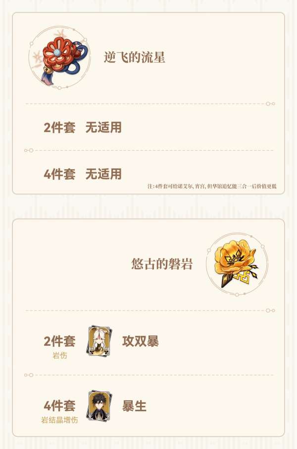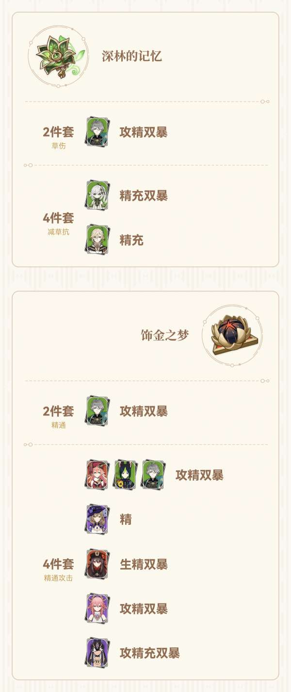 而对于原神中圣遗物的要求,本系列攻略已有结论,除了特殊情况,遵循“花羽部分仅考虑本套装内角色适用;沙、杯、冠部分要考虑能够成为散件,按主词条筛选”。