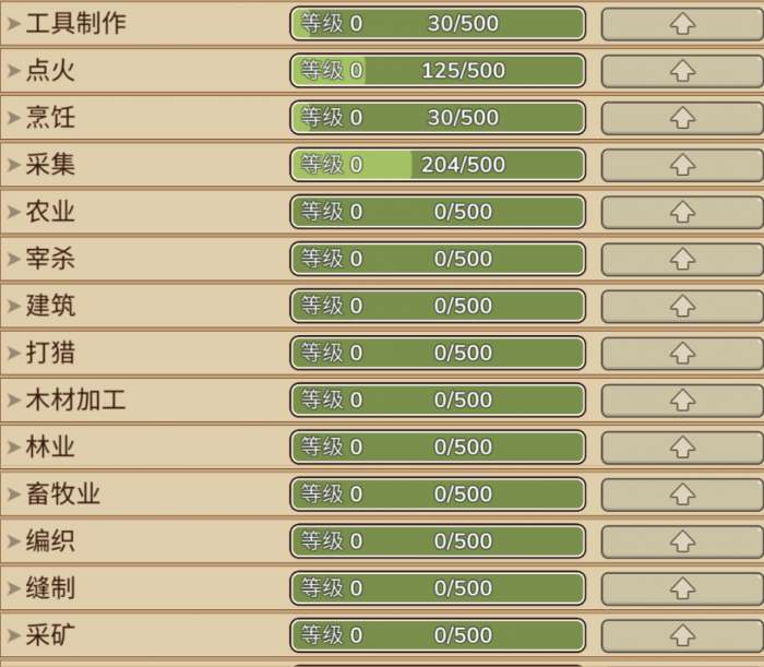 当村民与部落里完成工具制作后。能够吸取到该项功能的成功经验。当经验值达到上限后就能提升技能水平,提高工具制作的效率。