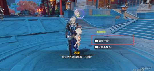 派蒙出现,进入对话,它会询问我们要不要偷看,当然选择“就看一眼···”(获取成就选项),反之选择不看,就不会获得成就