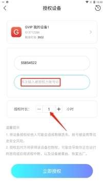 授权设备:授权设备指的是,把你自己账号下的设备授权给对方账号进行操作使用,授权时间最低一小时。但是要注意哦,对方会操作你的设备,要注意设备中的数据哦,防止丢失。当然,授权出去的设备,你也是可以随时收回你的设备的。