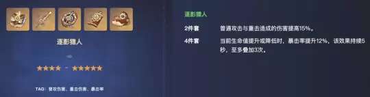 圣遗物推荐:建议使用猎人四件套。这套装备属性可以通过生命值的变化来增加伤害,基本上其他角色都可以使用这套装备,而且使用范围更广泛。