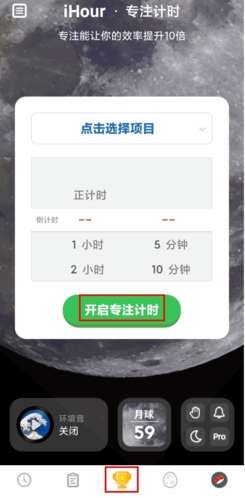 软件提交 专题合集 热门手游打开ihour应用,在首页找到类似小奖杯形状的“专注计时”图标并点击,进入专注计时页面后,选择要专注的项目,设定好倒计时时长,点击“开启专注计时”按钮,系统便会自动启动倒计时,页面显示剩余时间即表示操作成功。