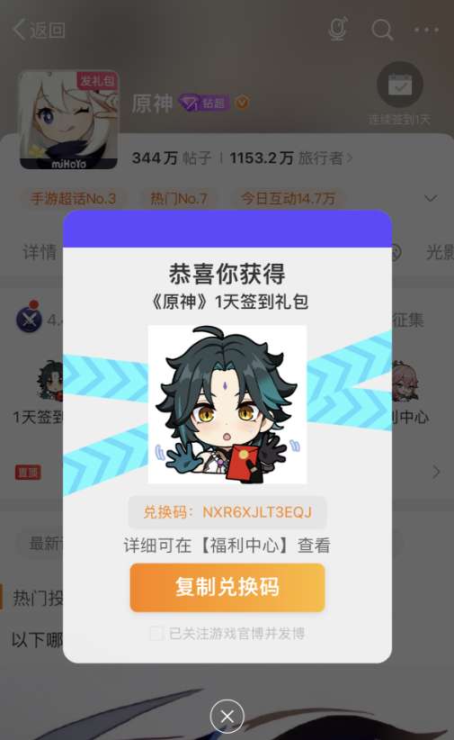 点击签到之后,会出来一个弹窗,上面是第一天签到成功之后的福利兑换码,复制兑换码就可以去游戏内领取奖励了。连续签到1/2/3天,就可以领取对应天数的奖励。