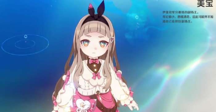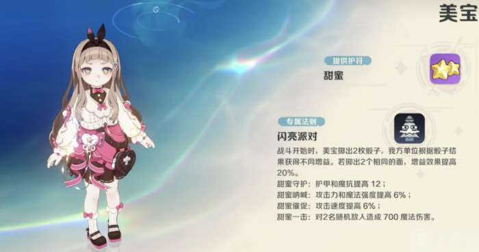 如果大家被美宝外观吸引的话,那么后期在实战上面也要用好这个角色,美宝目前的话,在游戏当中是具有一个亲和力很高属性的角色,她外观上面的黑色蝴蝶结也带来了更多的少女气息,在核心技能上面有一个闪亮派对的效果,这个效果是在战斗的一开始就可以自动触发的,所以说一个被动的能力在此时触发这个技能的话,美宝会投掷出来两枚骰子,这个骰子会决定我方目前团队获得的增益效果是什么。