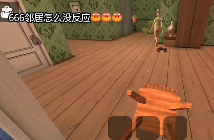 13、令人毛骨悚然的事情出现了,我们的邻居发现了我们,然后就来抓我们了,只是他这姿势和表情实在让人觉得有些恐惧,再加上游戏中会出现恐怖的音效,小编看到邻居走过来的时候瞬间鸡皮疙瘩都起来了。