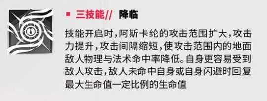 技能开启后,阿斯卡纶的攻击范围将扩大,同时攻击力也会提升,攻击间隔也会变短。此外,技能还会使得阿斯卡纶攻击范围内的地面敌人的物理和法术命中率降低。