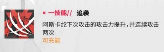 技能开启后,阿斯卡纶的攻击力会提升,同时会使攻击范围内的地面敌人移动速度减缓。在地面敌人被阿斯卡纶击倒时,会向周围的敌人施加第一天赋效果。