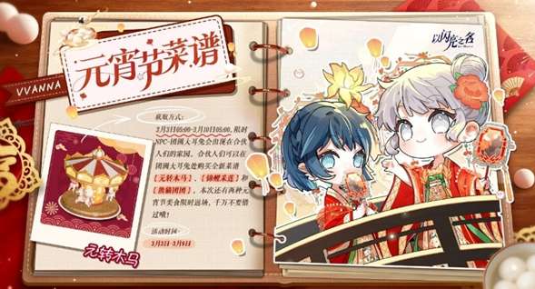 软件提交 专题合集 热门手游以闪亮之名3月3日至10日元宵节期间,限时NPC“团圆大耳兔”将出现在家园中,玩家可前往购买全新菜谱【元转木马】【锦鲤采莲】【熊猫团团】,同时还有两款往期元宵美食限时返场,不要错过。