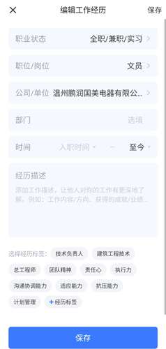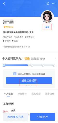 2、通过编辑和描述工作经历来完善自己的简历;