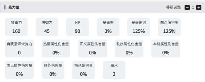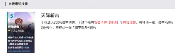 这一个角色其实就是带有秩序群攻标签的友纪,实际在上手之后才会发现,这一位决斗家的强度还是很不错的。满命体验就能感受到来自于他身上的一些诸多限制,核心的定位就是秩序属性群体输出,异能就是迅捷。基础面板中规中矩,例如一级攻击力是160,防御力是45,暴击率是3%,暴击伤害是125%。这就属于一个五星角色的标准水平,主要的亮点就在于自我意识技能天际斩击。一旦在释放之后,可以针对敌方全体造成300%的基础性伤害,并且还可以把手牌中的自身攻击卡牌移至到顶端。