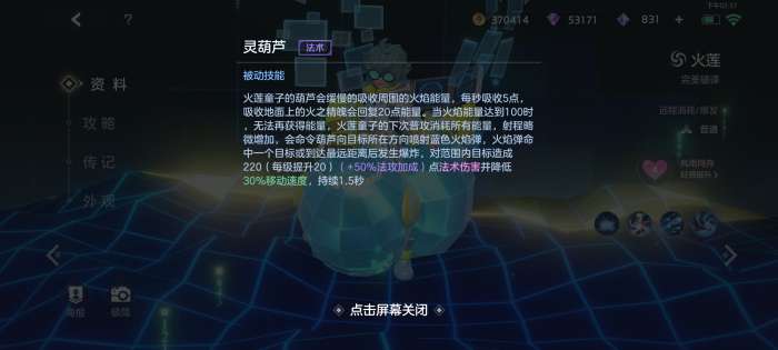 火莲会周期性吸收周围的能量为被动充能,拾取1技能产生的火之精魄会填充20的能量;