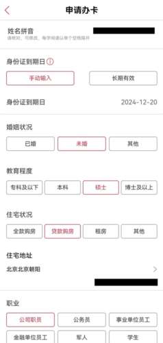 5、如果您近期没有办理过我行信用卡,则需要填写身份证到期日、婚姻情况、教育程度、住宅情况、职业信息、税前收入、联系人、邮寄地址等,提交申请。