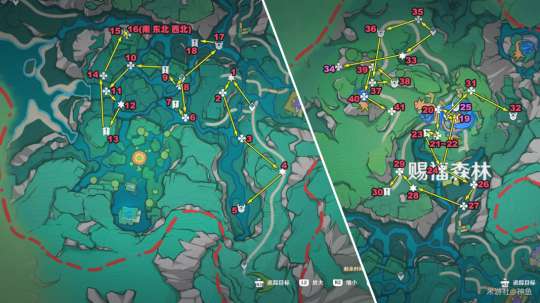 4.8限时地图「希穆兰卡」一阶段共有「48个宝箱」+「93个悠乐片段」,此篇攻略包含「41个宝箱」+「41个悠乐片段」,分布如下图所示——