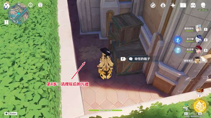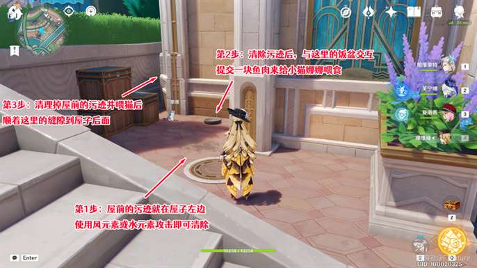 第一处污迹就在屋子左侧(面向屋子时),可以用水元素或风元素技能攻击来清理,之后与饭盆交互,提交一块鱼肉即可喂食。完成后,我们沿着屋子旁边的缝隙前往屋子后面。