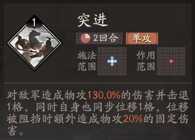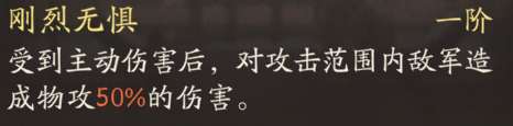 范围攻击效果可以期待,特别是可以主动触发韩浩的天赋,可惜本技能在突骑兵线,学习需要一定成本,低氪金度玩家不推荐开启。