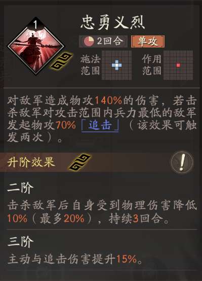 不走突骑兵线就必须升迁4才能入手的技能,实际效果为使用140%倍率的一击击杀目标后,触发追击,如果追击继续击杀则会触发第二次追击,第二次追击不再追加判定。